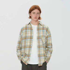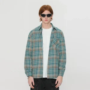 100% Cotton Men's Long Sleeve Shirt Stand Collar Half Button Plaid Shirt Men's Casual