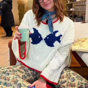 Sping Autumn and Winter Women's Fashion Casual Vacation Cute Simple Fish Pater Color Coision Design Long Sleeve Sweater Women