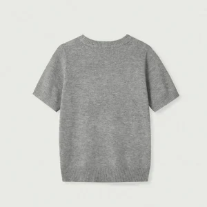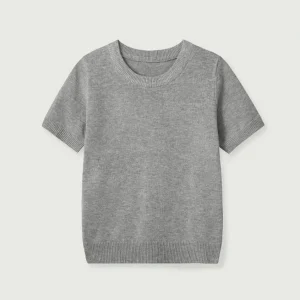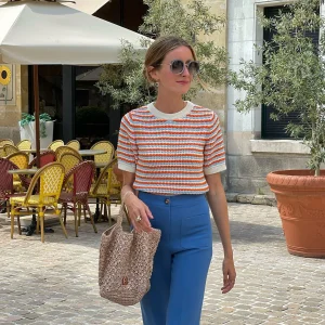 Spring-summer striped knit top elegant, comfy, round-neck short-sleeve. Perfect for travel daily wear. Soft, stylish versatile