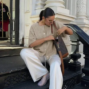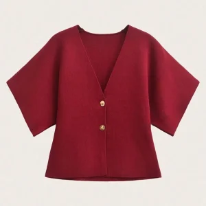 New Entry Women's Fashion Casual V-Neck Metal Button Loose Knit Cardigan Plunge Neck Top