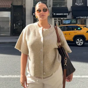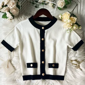 Spring and Autumn Women's Casual Vacation Fashion Hundred Solid Color Loose Round Neck Short Sleeve Button Cardigan Sweater