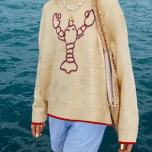 Summer Fashion Casual Vacation Beach Ladies Lobsterembroidery Color Clashing Design Long Sleeve Sweater Brunch Outfits for Women