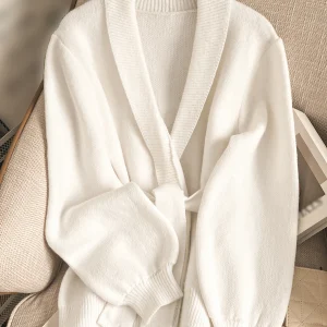 Autumn/Winter women's elegant cardigan: deep V-neck, solid color, white collar/cuffs, stripe hem, tie belt. Urban casual style