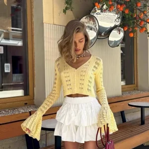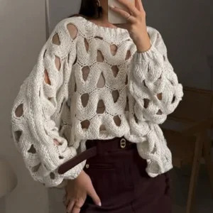 Women's Casual Sonic Knitted Sweater with Autumn Bell Sleeve Semi-Sheer Hollow-Out Design for Fall