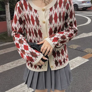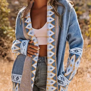 Women's Retro Pattern Long Sleeve Knitted Cardigan Sweater Coat Casual Pocket Design