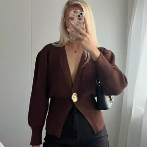Women's Fashion Casual Trendy Versatile Solid Knit Metal Button Long Sleeve Everyday Cardigan