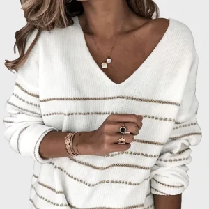 Women's Casual Everyday V-Neck Striped Knit Pullover Sweater Breathable Print Design for Autumn and Winter Use Front