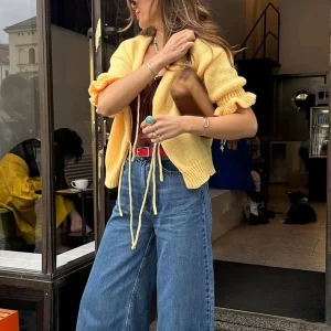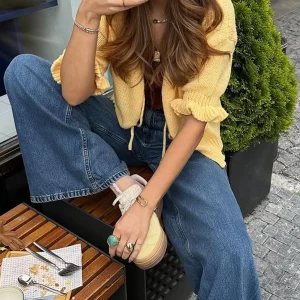 Women's Casual Fashion Commuter Daily Early Spring Goose Yellow Petal Ruffle Half Sleeve Tie Loose Short Sweater Cardigan